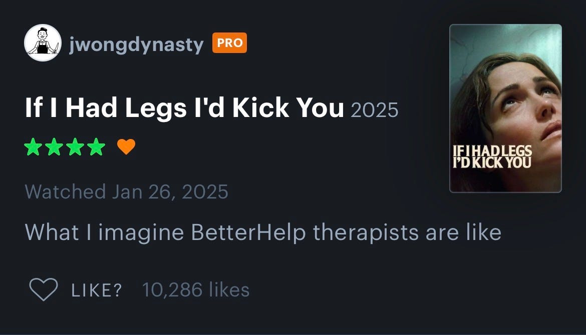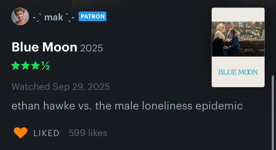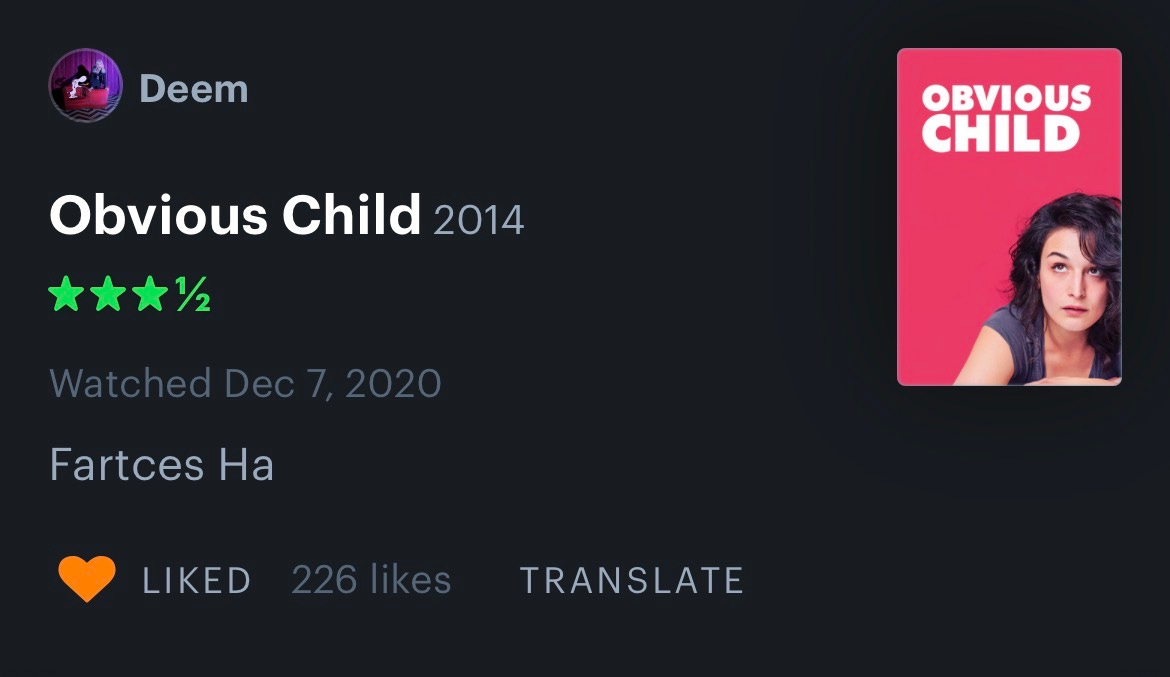 On to the movies… Parker and I watched If I Had Legs I’d Kick You (HBO) and Blue Moon (Netflix), and then we needed a palette cleanse so we watched Obvious Child (Netflix) for the first time! Obvious Child was my favorite of the three. Here are the Letterboxd reviews for each that made me lol the most and/or captured my opinions: