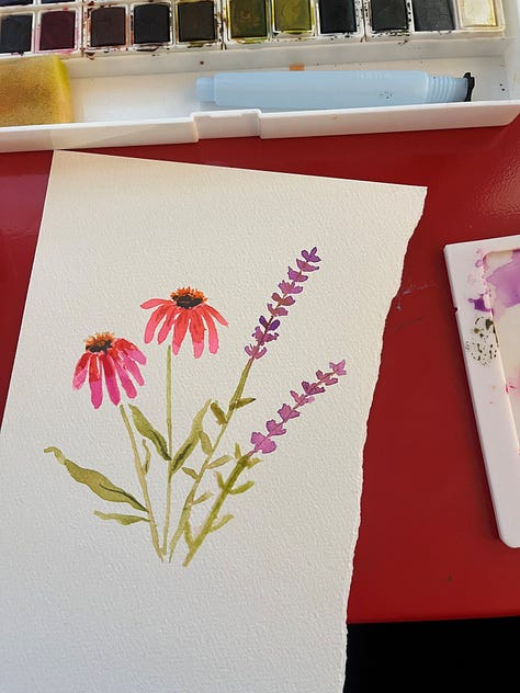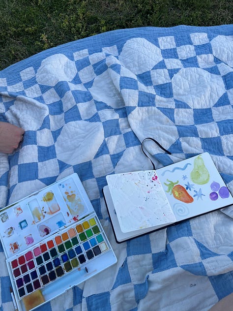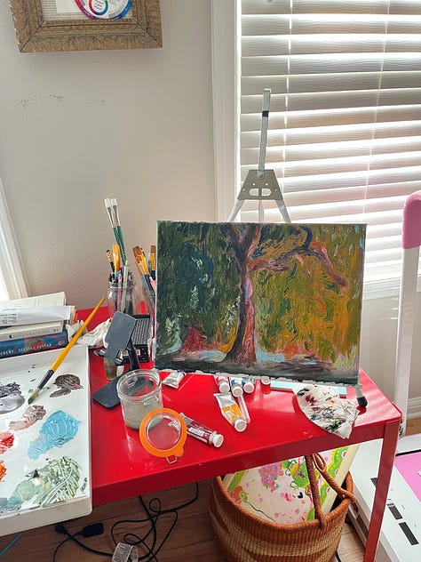 Okay, if you’ve been following along on my Substack notes, you’ll see that I started a 100-day art challenge on my birthday. I have since… stopped the challenge. Now, I am pretty good at seeing things through when I really want to (ahem, The Artist’s Way), but in this case, the structure of the challenge wasn’t actually getting me any closer to the creative goals I have. I am wanting to get better at oil painting and to explore that medium and find my style a bit more. The parameters that I set for myself were just to spend at least 10 minutes each day on something creative. And I did do that for about two weeks straight, but I wasn’t reaching for oil paint every day. I was painting in watercolor, doodling, or junk journaling because it was quicker and easier to set up and clean up. While those creative moments were useful in the grand scheme of things, it wasn’t what I set out to do really, and it felt very obligatory. If you read this post, you know that I’m specifically not looking for an increase in obligations right now, so I’m giving myself permission to just… stop. I’d rather oil paint a couple times a week than feel the need to add something to my routine that’s not helping. Anyway, before I abandoned it, here are some of the things I painted!